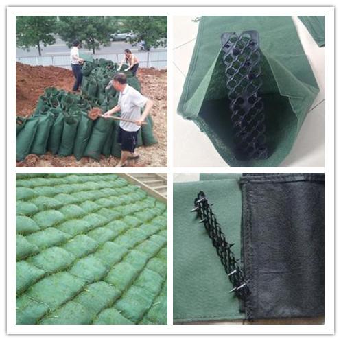生態袋在嚴峻鹽堿地段、無土屋頂等無法種植和移植草坪的地段施工。利用邊坡巖面本身的凹陷處,在凹陷處下部采用植生袋圍堰,圍堰內填士,種植灌木為主,植生袋內裝人按一定比例配制的耕植土、有機基質、保水劑、肥料。或在坡面外側直接用生態袋梯形疊砌,形成一層植生袋面層,通過該植生袋內種子的生長來綠化邊坡。